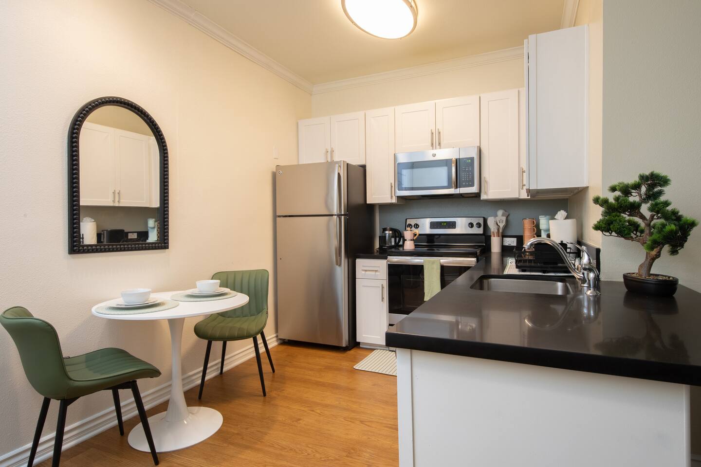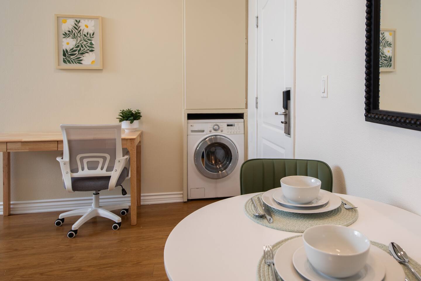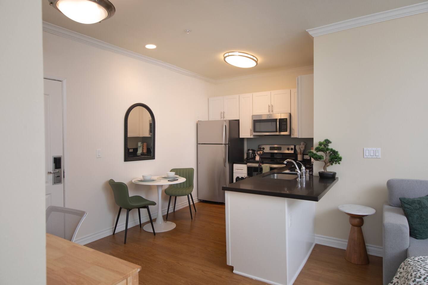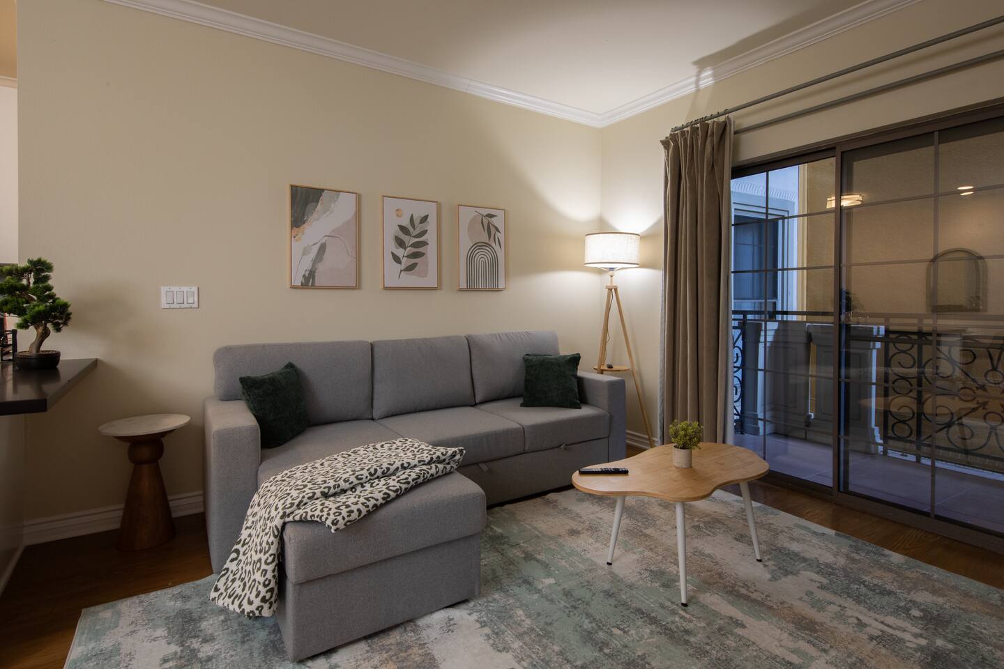 Crafted for your ultimate Santa Monica experience, the unbeatable location lets you walk to shopping, dining, and the ocean in just a few minutes the and the private balcony gives you a perfect spot to relax after a beach day. Space highlights: •One cozy bedroom with a comfortable bed and linens. •Comfortable pull out sofa bed that sleeps two additional guests, perfect for friends or family's traveling together. •Spacious living area that flows onto your balcony, bringing in natural light and fresh coastal air. •Full bathroom with shower/tub combo and essentials for both short and extended stays. Amenities •Fast Wi-Fi and a small workspace, perfect for remote work between beach walks. •Well-equipped kitchen for simple cooking, takeout nights, and morning coffee before heading out. •In house washer/dryer for your convenience. •Easy, secure self check-in and access to nearby parking structure. Location: A prime location! You’ll be just a short walk to the Pier, Santa Monica Beach, Third Street Promenade, and Santa Monica Place, so you can shop, dine, and explore from morning to night. You are also around the corner from the metro/bus hub, making it simple to reach the rest of Los Angeles without a car.