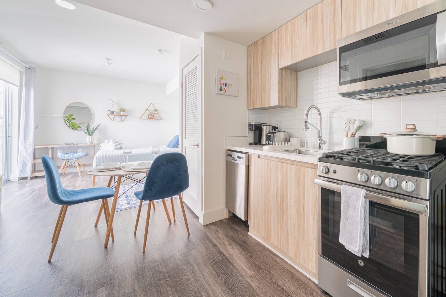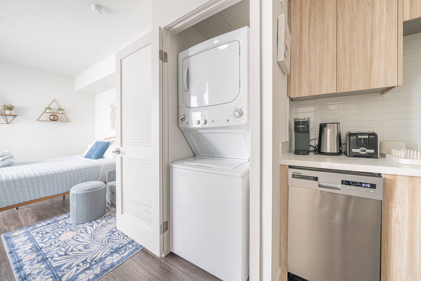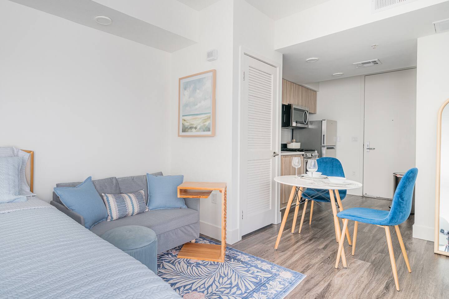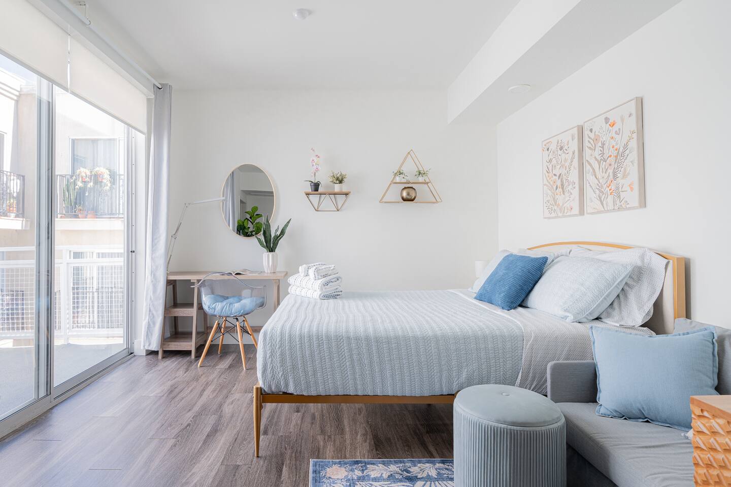 This cozy studio is designed for comfort and convenience, with a warm, inviting feel from the moment you walk in. A thoughtfully arranged living/sleeping and working area opens onto a spacious balcony, giving you extra room to relax with your morning coffee or unwind in the evening. The new kitchen appliances make cooking or heating up meals easy and enjoyable, while the in-unit washer and dryer mean you can pack light and stay as long as you like. It’s a stylish space that feels like your own little Santa Monica retreat. 🌴✨ Guests are welcome to request early check-in starting at 1:00 PM or late check-out until 2:00 PM for a small additional fee, subject to availability. 😊